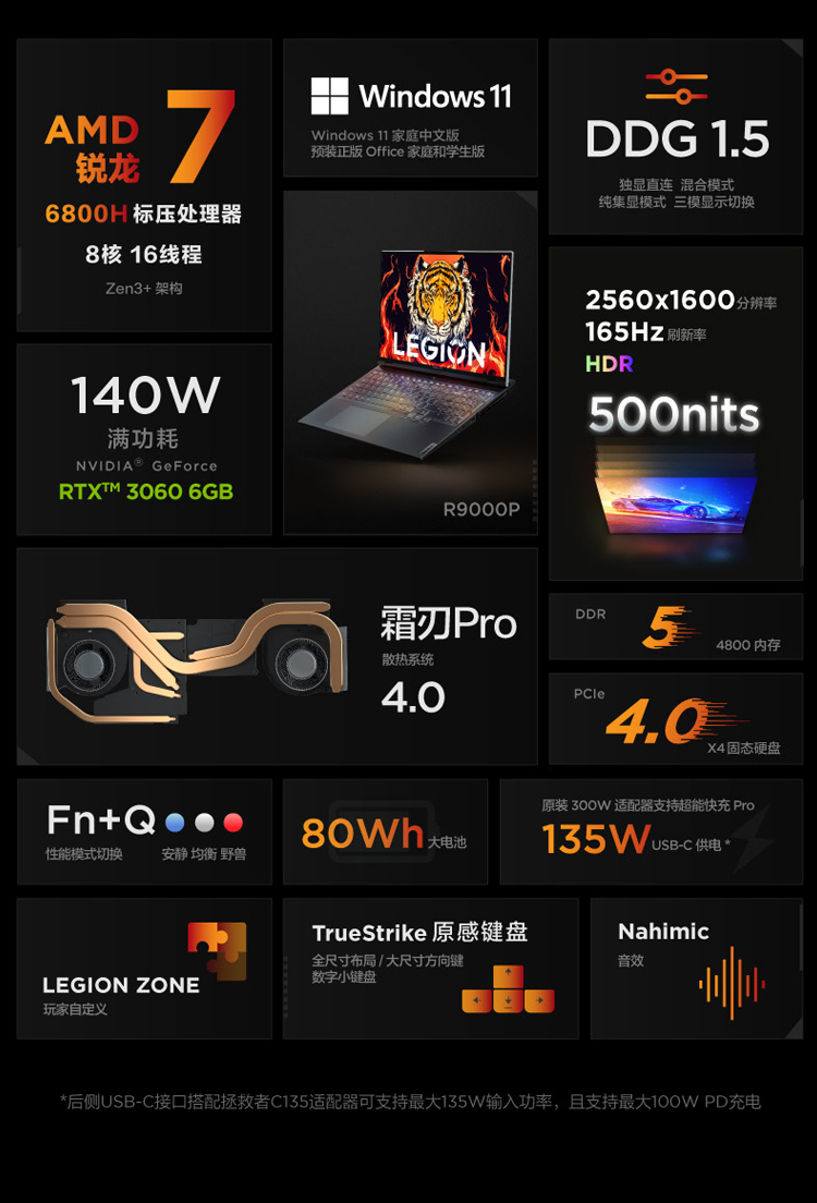 商品名称:联想拯救者R9000P 16英寸游戏笔记本电脑(8核16线程R7-6800H 16G 512G RTX3060 2.5k 165Hz高色域)